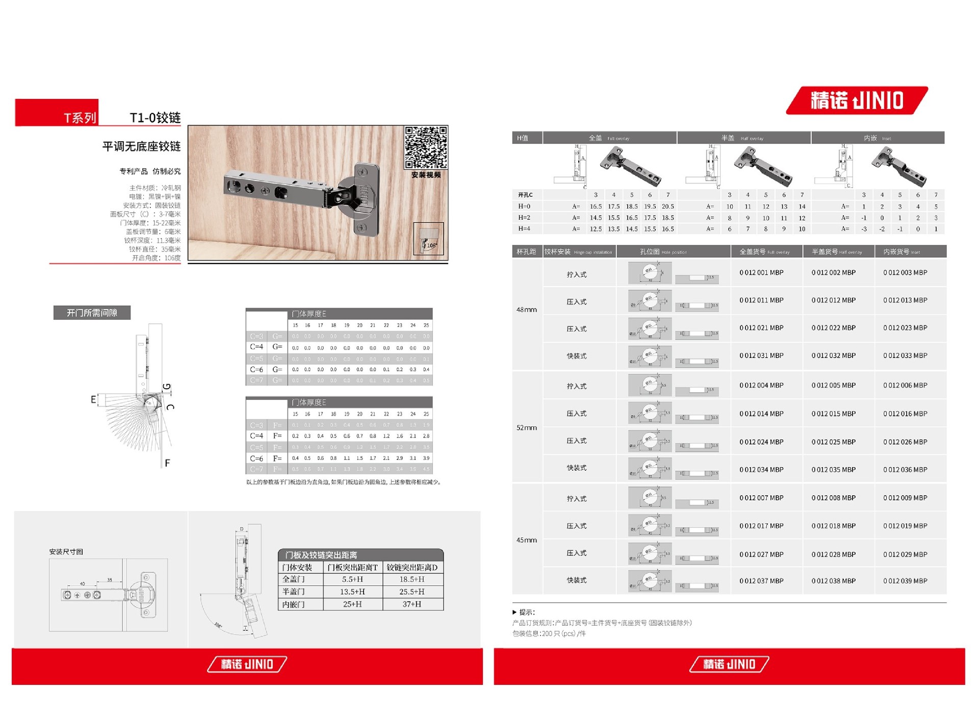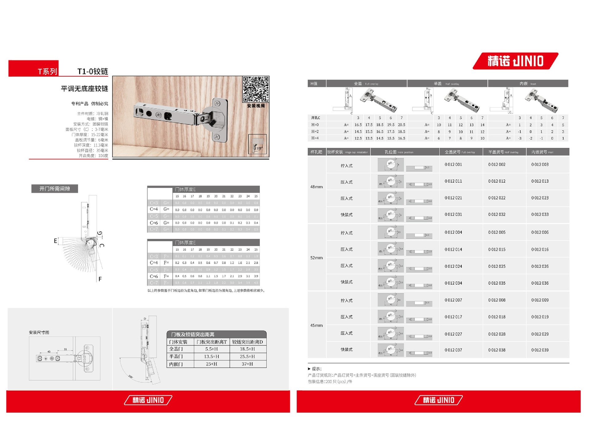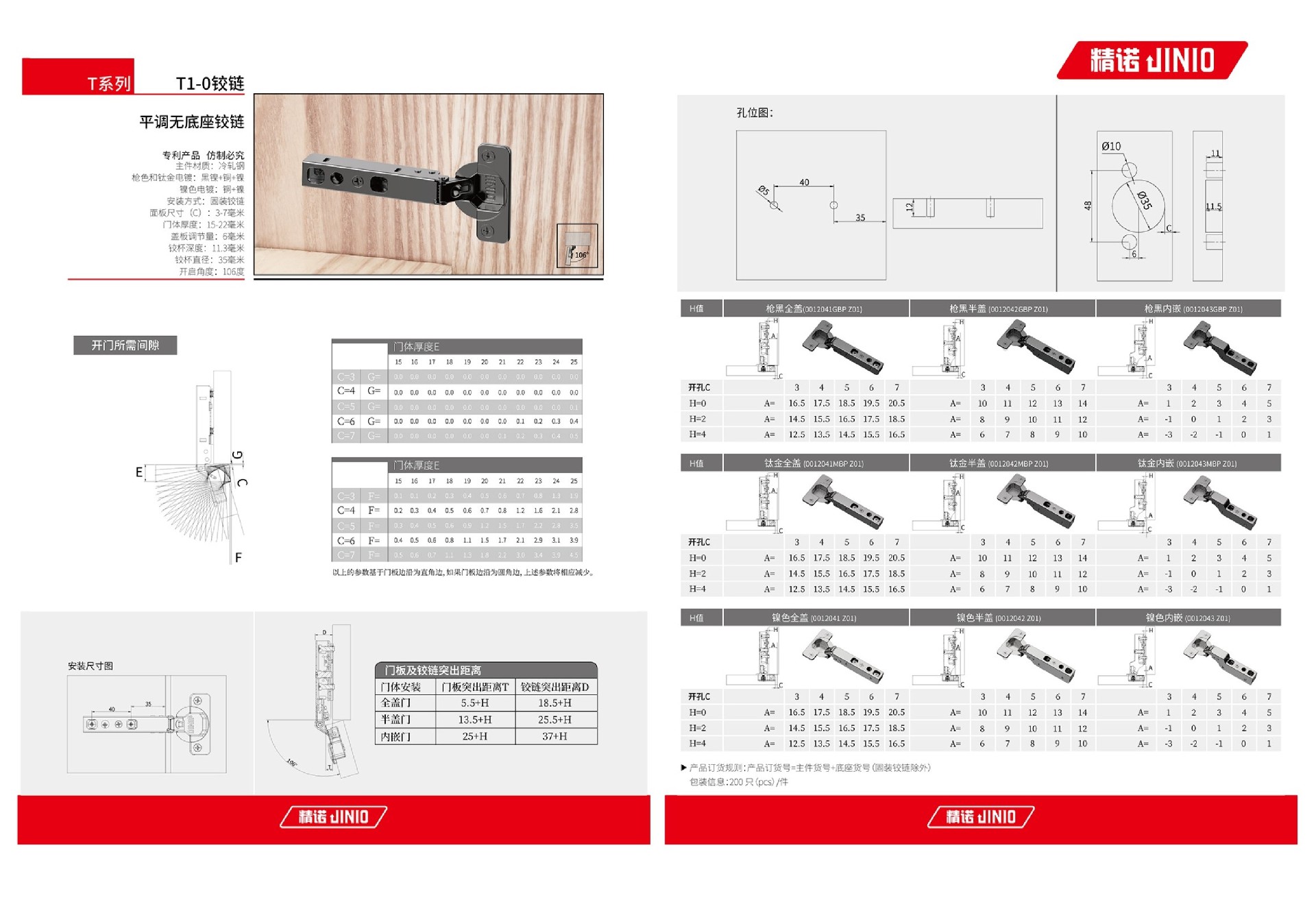阅读 2 · 发布日期 2024-02-27主件材质:冷轧钢 枪色和钛金电镀:黑镍+铜+镍 镍色电镀:铜+镍 安装方式:固装铰链 面板尺寸(C):3-7毫米 门体厚度:15-22毫米 盖板调节量:6毫米 铰杯深度:11.3毫米 铰杯直径:35毫米 开启角度:106度.