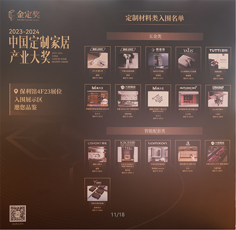件;隐形层板托等。其中平调无底座铰链和隐形层板托通过了金定奖的线上初评,获得线下