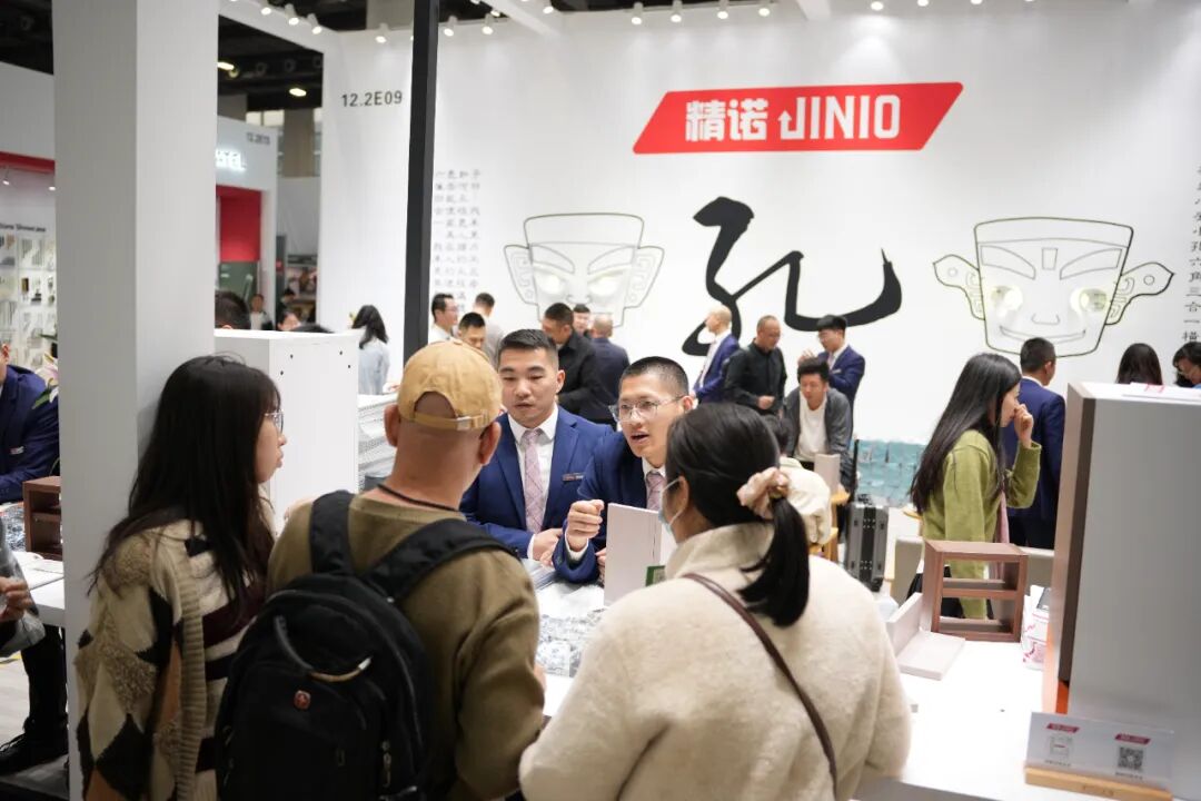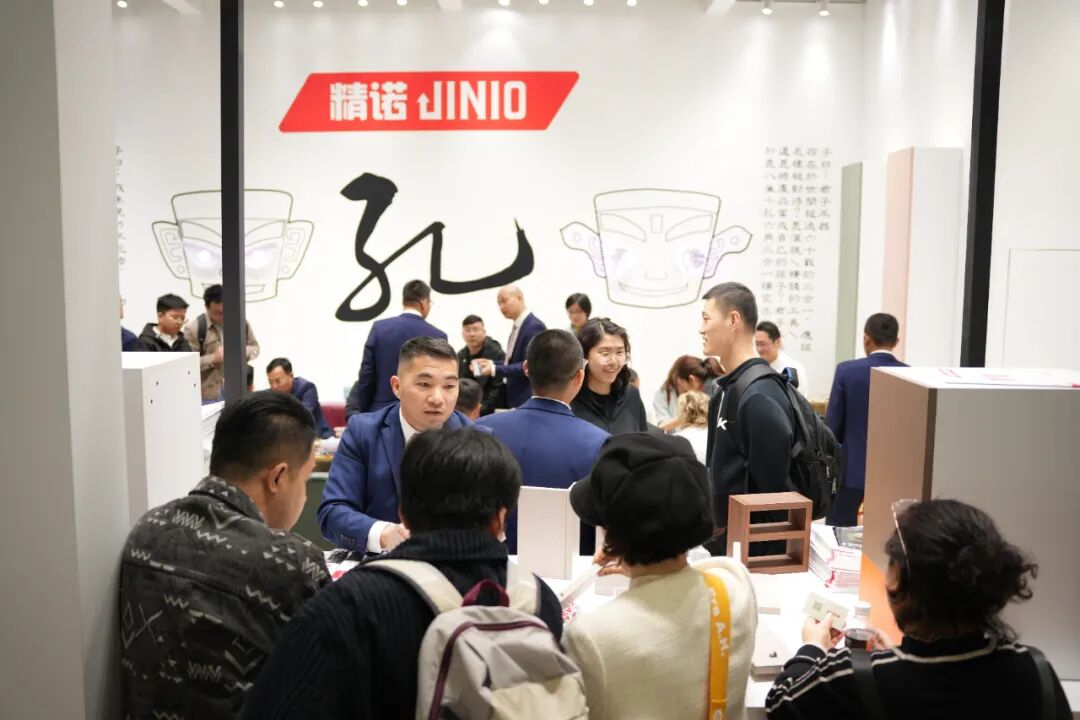 展会首日,精诺五金的展位(S12.2E09)便凭借独具匠心的设计吸引了大量观展人员驻足参与。主推产品J11B、J8F小洞天、J6-8、平调铰链一经亮相,就引发了热烈关注,将气氛推向高潮。