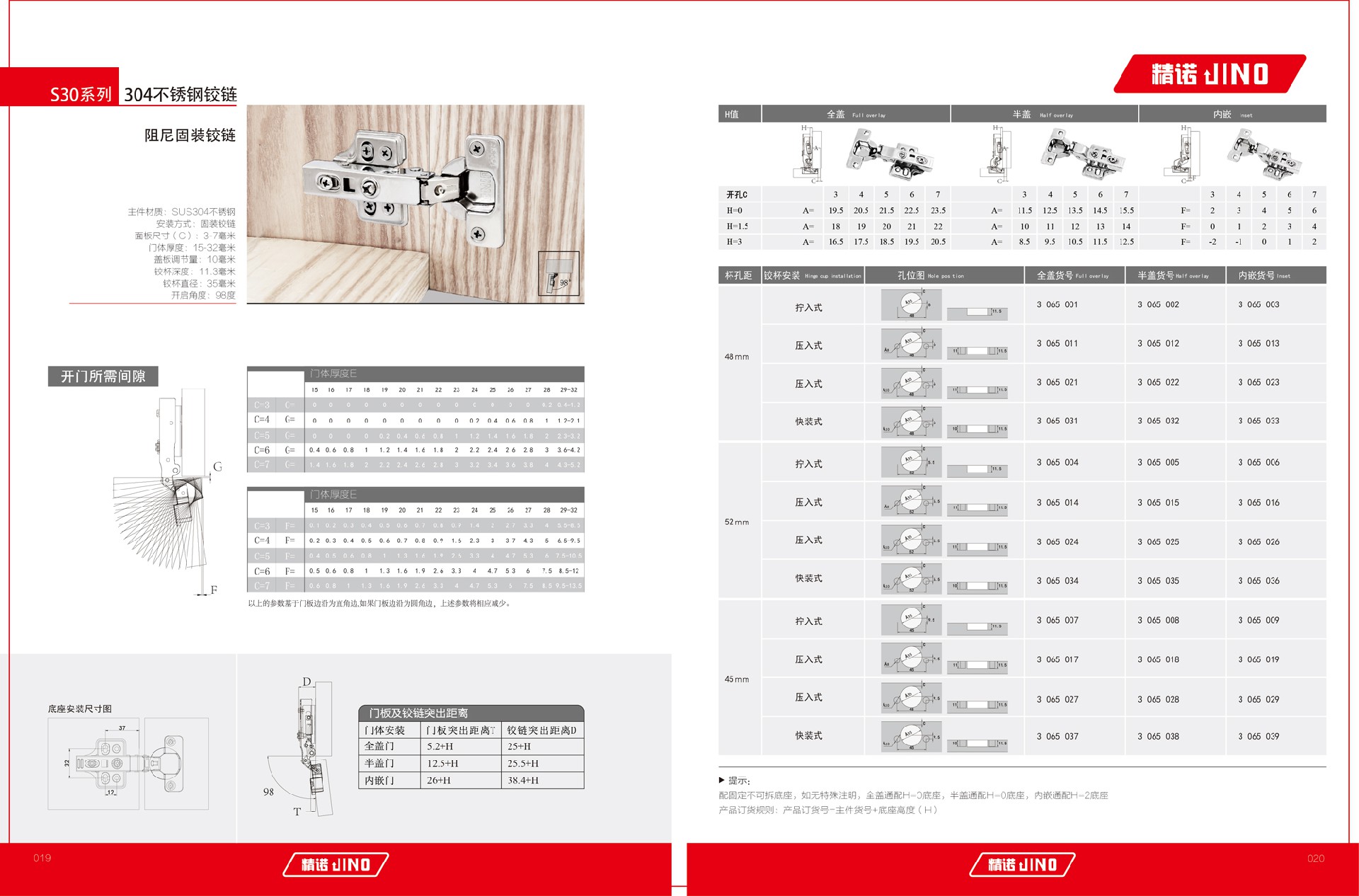 主件材质:SUS304不锈钢 安装方式:固装铰链 面板尺寸(C):3-7毫米 门体厚度:15-32毫米 盖板调节量:10毫米 铰杯深度:11.3毫米 铰杯直径:35毫米 开启角度:98度...