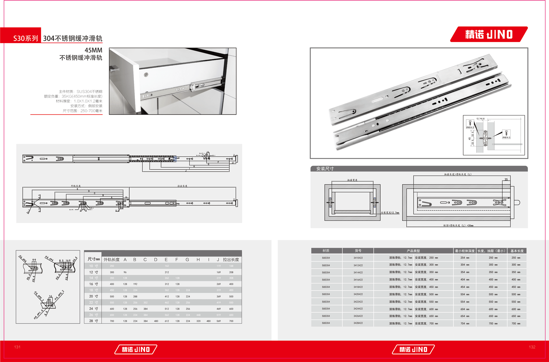 主件材质:SUS304不锈钢 额定负重:35KG(450mm标准长度) 材料厚度:1.0X1.0X1.2毫米 安装方式:侧部安装 尺寸范围:250-700毫米...