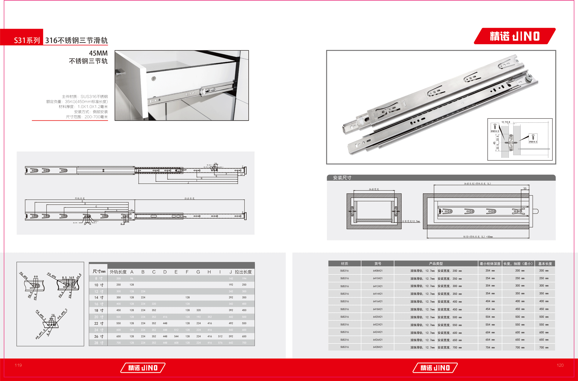 阅读 1888 · 发布日期 2022-04-24主件材质:SUS316不锈钢 额定负重:35KG(450mm标准长度) 材料厚度:1.0X1.0X1.2毫米 安装方式:侧部安装 尺寸范围:200-700毫米...